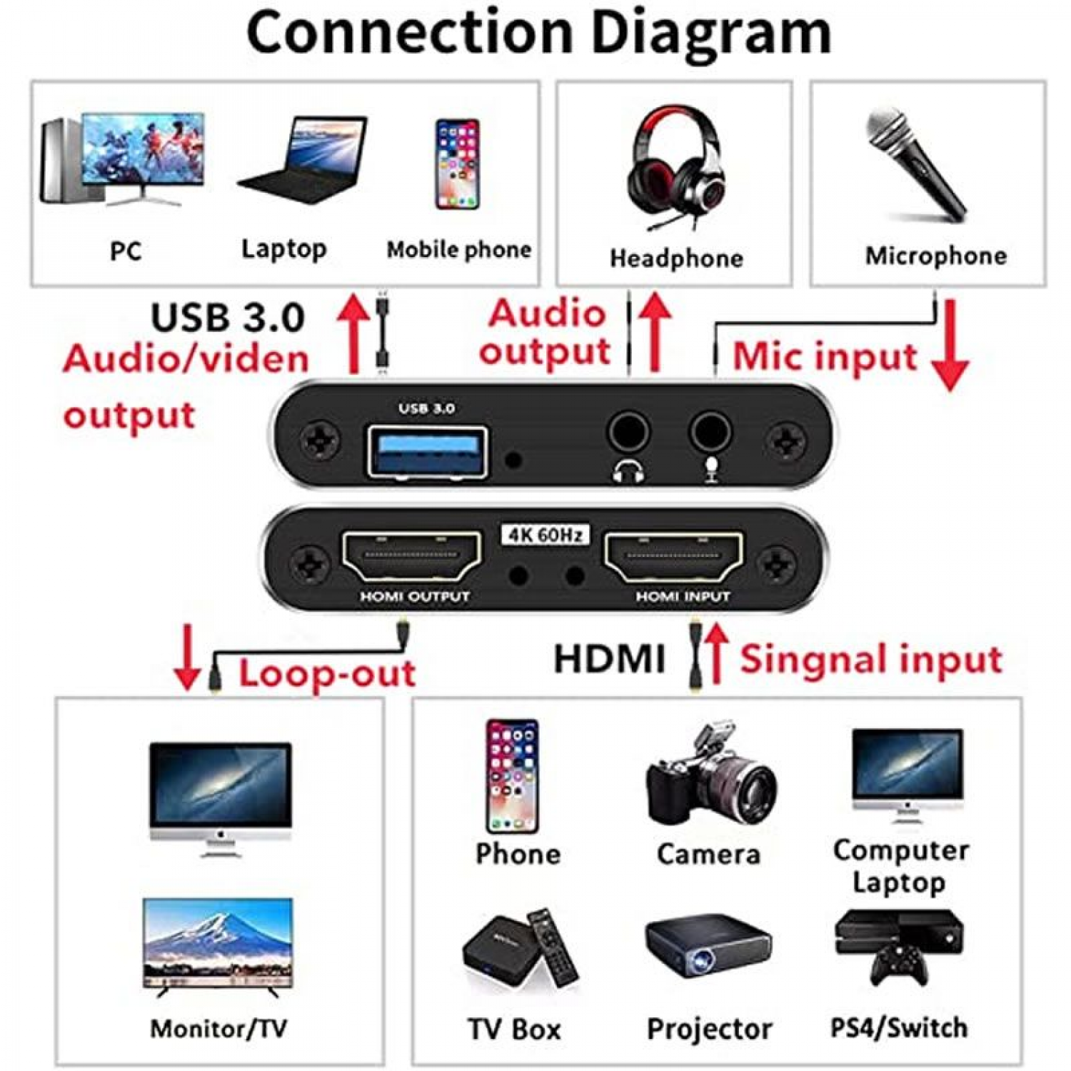 -Capture resolution up to 1080p at 60fps for video source and it is ideal for all HDMI devices such as PS4, PS3, Xbox One, Xbox 360, Wii U, Nintendo Switch, DVDs, DSLR, Camera, Security Camera, and set-top box