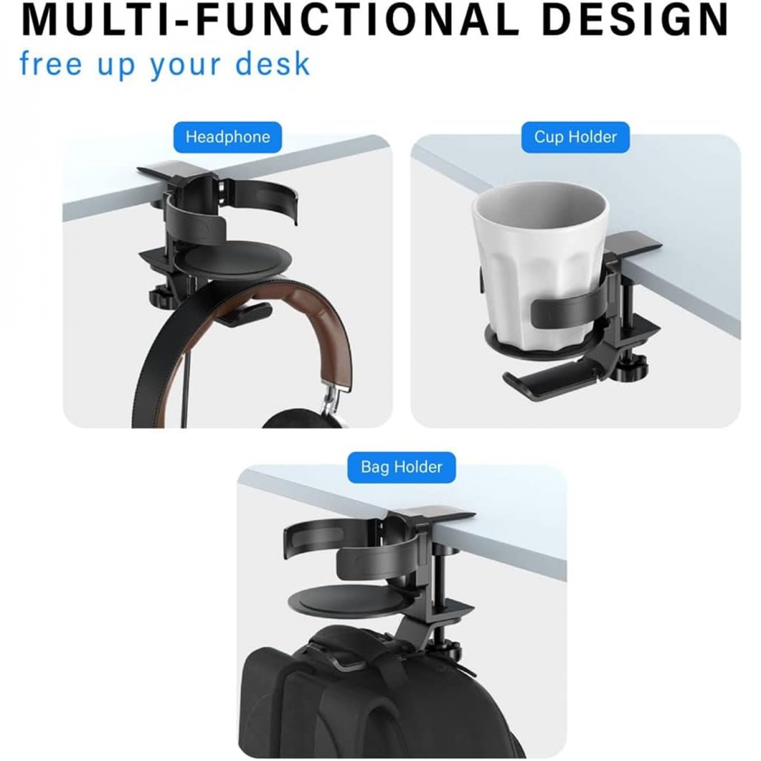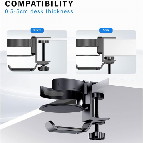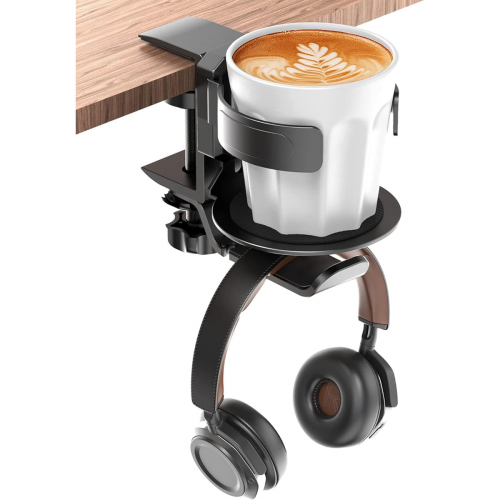 - Designed to clamp securely under desks or tables, it saves valuable desk space while keeping your cup and headphones easily accessible yet out of the way.
