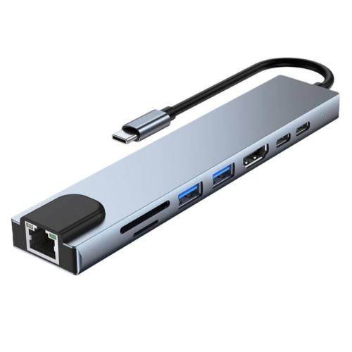 Material: Aluminum alloy Resolution: 4K 30HZ 8 in 1 USB-C HUB 4K/30HZ: 1xHDMI+2xUSB 2.0+1xPD+1xUSB C+1xSD+1xTF+1xRJ45 HDMI: 4Kx2K(3840x2160)30HZ, downwards compatible with 1080P 720P etc. USB3.0: Hight speed USB3.0 transmit 5GB/S,Power supply up to 4.5W max, USB C Female port: 20V@3A,Support max 87W power adapter, USB C male: compatible with thunderboil 3,Make sure that the host USB-C port on your device complies with the USB2.0 Specification SD / TF card reader: SD and TF cards can work simultaneously, read and write speed depands on cards' quality RJ45: Max Ethernet speed: 100Mbps