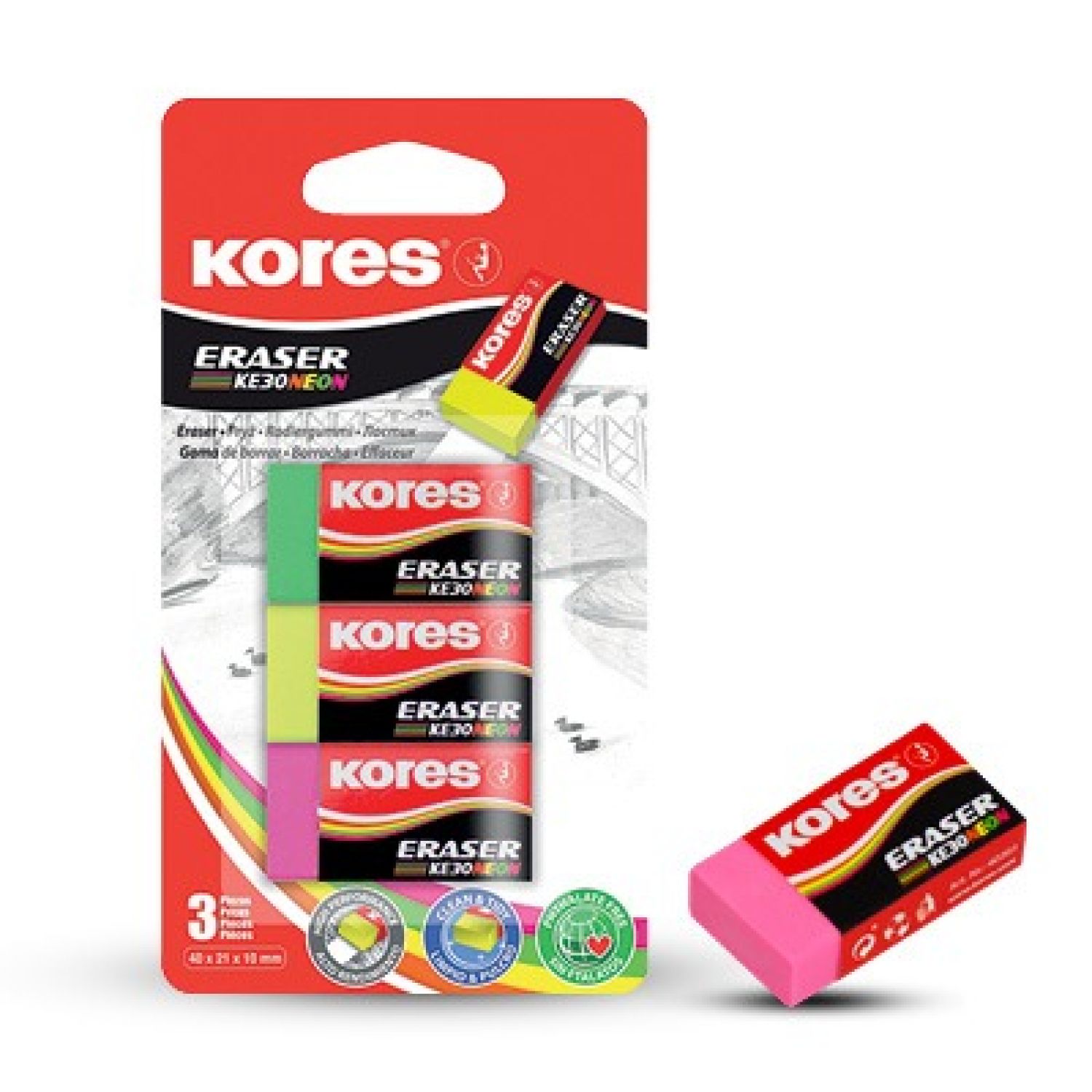 Kores ERASER Medium Neon Pk3 (40313)*104633*