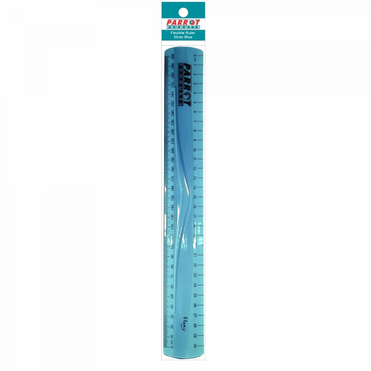 The SA0030D Parrot Flexible Blue ruler is shatterproof and flexible and can measure in both cm and mm.