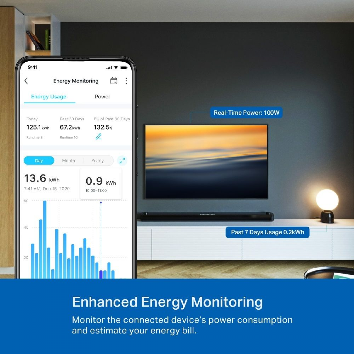 - Energy Monitoring: Monitor real-time power consumption and energy spend via the TAPO App.